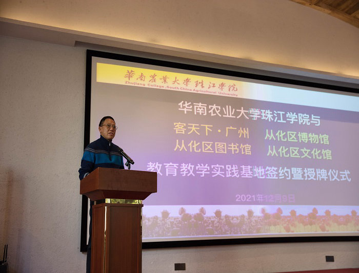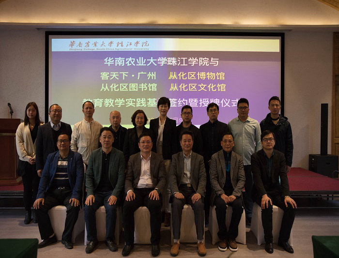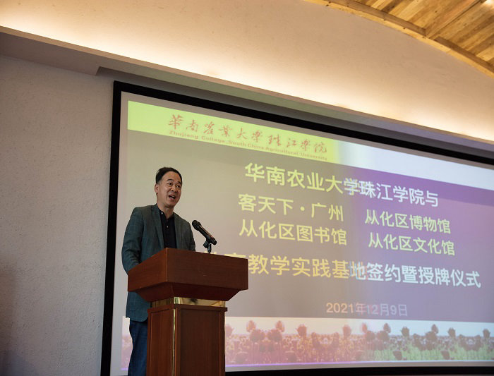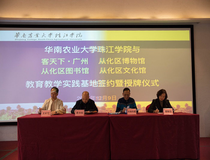 12月9日下午,华南农业大学珠江学院传媒学院与从化区图书馆、区文化馆、区博物馆、鸿客集团广州公司在客天下•广州国际旅游度假区幸福厅举行了教育教学实践基地签约暨授牌仪式(以下各单位简称为“华珠传媒”、“区图书馆”、“区文化馆”、“区博物馆”、“广州客天下”),从化区常委、宣传部部长骆志雄与从化区文广旅体局总工程师申国海莅临指导,从化区图书馆馆长邱跃、区文化馆馆长冯奕华、区博物馆馆长李小梅和华南农业大学珠江学院董事长宫俊全、华珠传媒学院院长梁深洪、华珠传媒学院党总支书记周玲军应邀到场。集团董事长蔡鸿章、广州公司总经理许文、集团董助申晓出席本次仪式。   从化区委区政府、区图书馆、区文化馆和区博物馆代表(左)与华珠传媒团队、客天下团队(右)签约暨授牌仪式现场仪式开始前,骆志雄常委代表从化区委区政府,对本次签约挂牌合作表示高度认可,认为五方共融共建教育教学实践基地,正是回答习近平总书记最关心的“如何将文化传播到每一个地方”这一问题的有力举措。同时,骆志雄常委对未来政校企各方优势互通、共创共赢表达了深切期待,希望广州客天下与区图书馆、区文化馆、区博物馆、华珠传媒着眼高处,“努力做民心相通的传播者,人文交流的促进者,为弘扬全人类的共同价值、推动构建人类共同体作出应有的贡献”,区图书馆、区文化馆、区博物馆作为宣传系统的重要组成部分,也将延续从化区委区政府的服务精神,对口支持高校人才培育需求和企业经营需要。