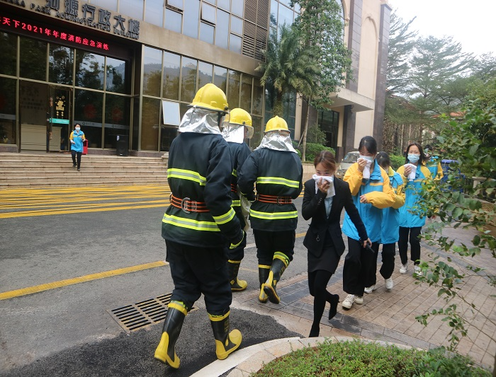 本次演习模拟行政楼三楼电线老化短路引燃窗帘随后火势扩大,安保巡查员发现后第一时间向消防监控中心报告,总指挥一行及消防工作人员快速反应,立刻启动消防应急预案。相关工作人员迅速投入到各自岗位,协助完成人员疏散、伤员救治,对被困电梯人员展开施救。楼内人员也反应迅速,立刻行动,湿毛巾捂住鼻口,按照安全疏散路线迅速撤离到疏散集合地,撤离现场井然有序。